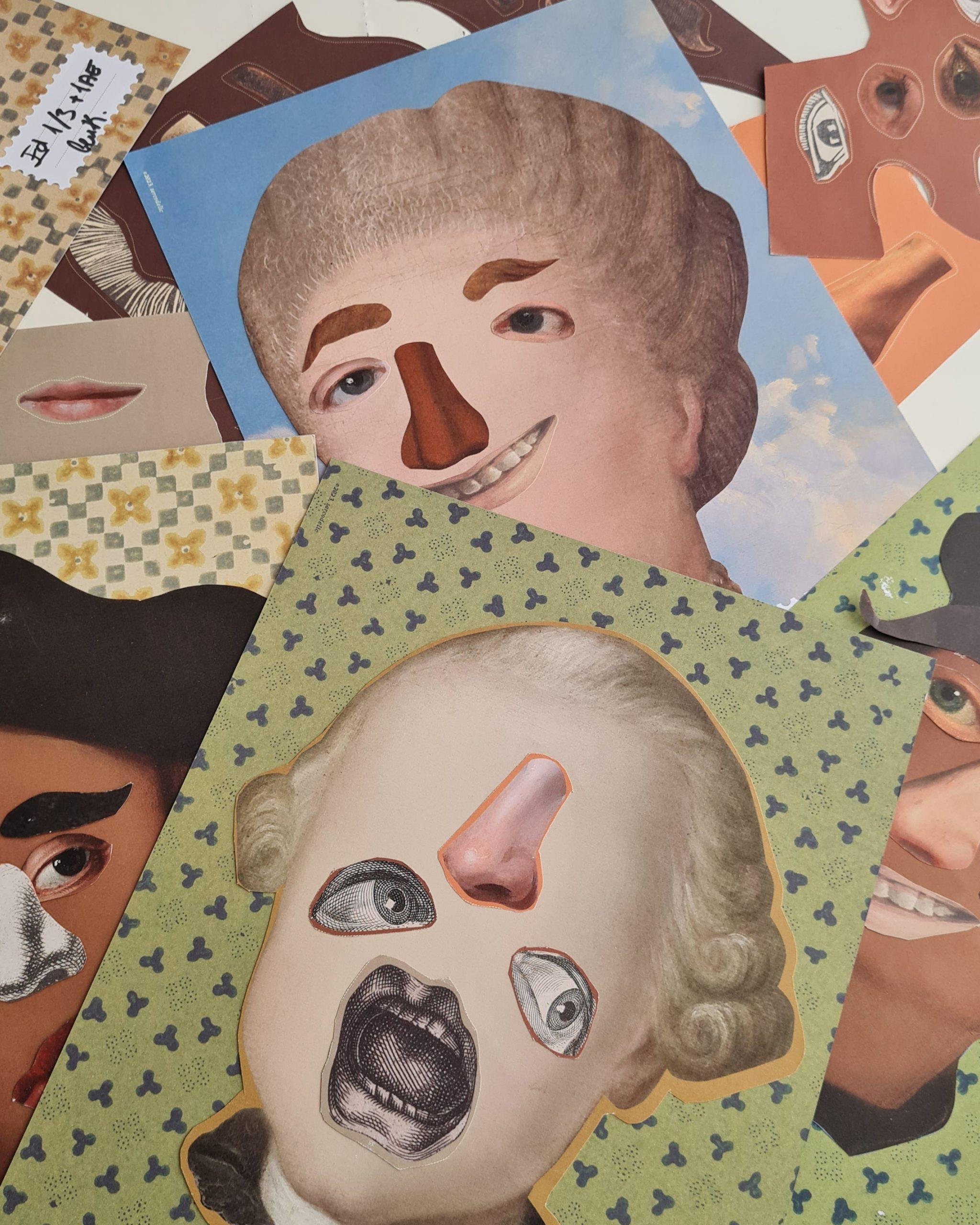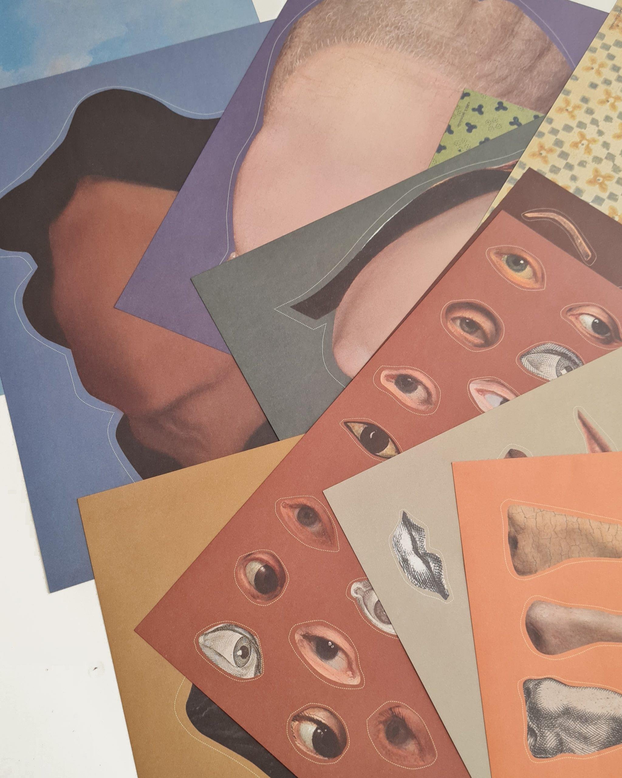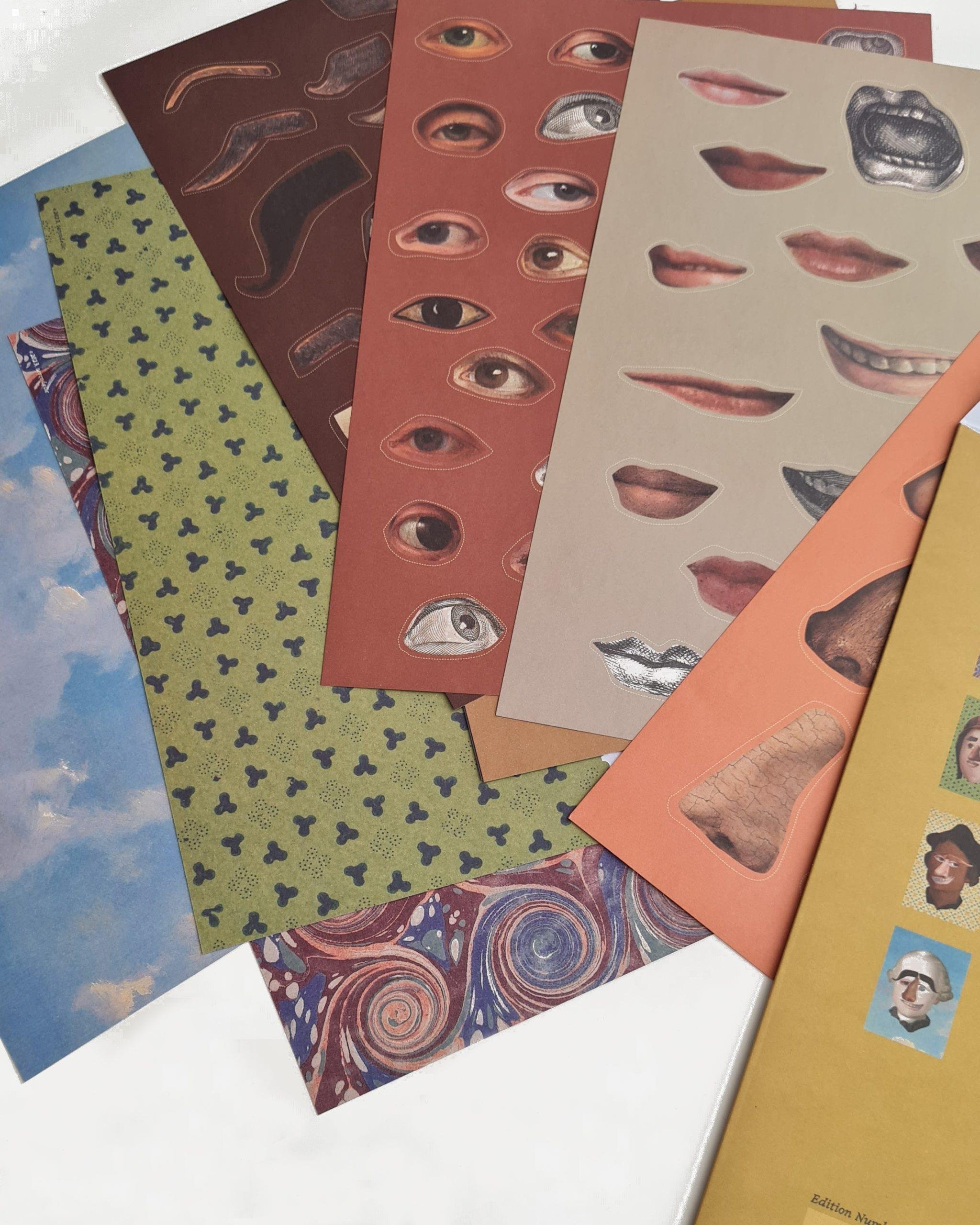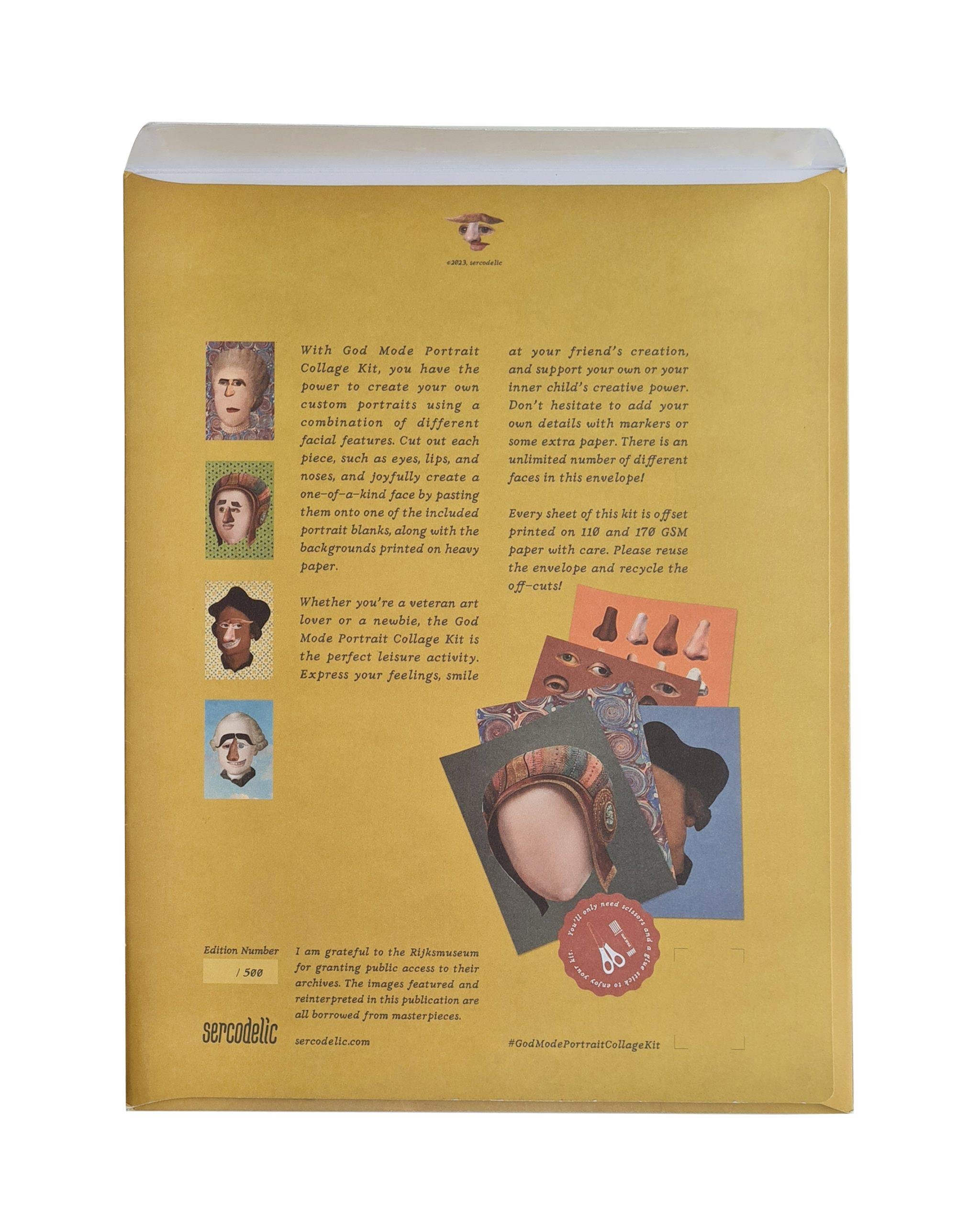God Mode Portrait Collage Kit, by Sercodelic, allows you to create your own custom portraits using a combination of different facial features, providing you with a fun and immersive experience. Cut out each piece, such as eyes, facial hair, lips, and noses, and joyfully create a one-of-a-kind face by pasting them onto one of the included portrait blanks, along with the background sheets. To set your creativity free, all you need is a pair of scissors and glue! Every sheet of this kit is offset printed on 110 and 170 GSM paper and only 500 editions have been produced. \n \n \n
