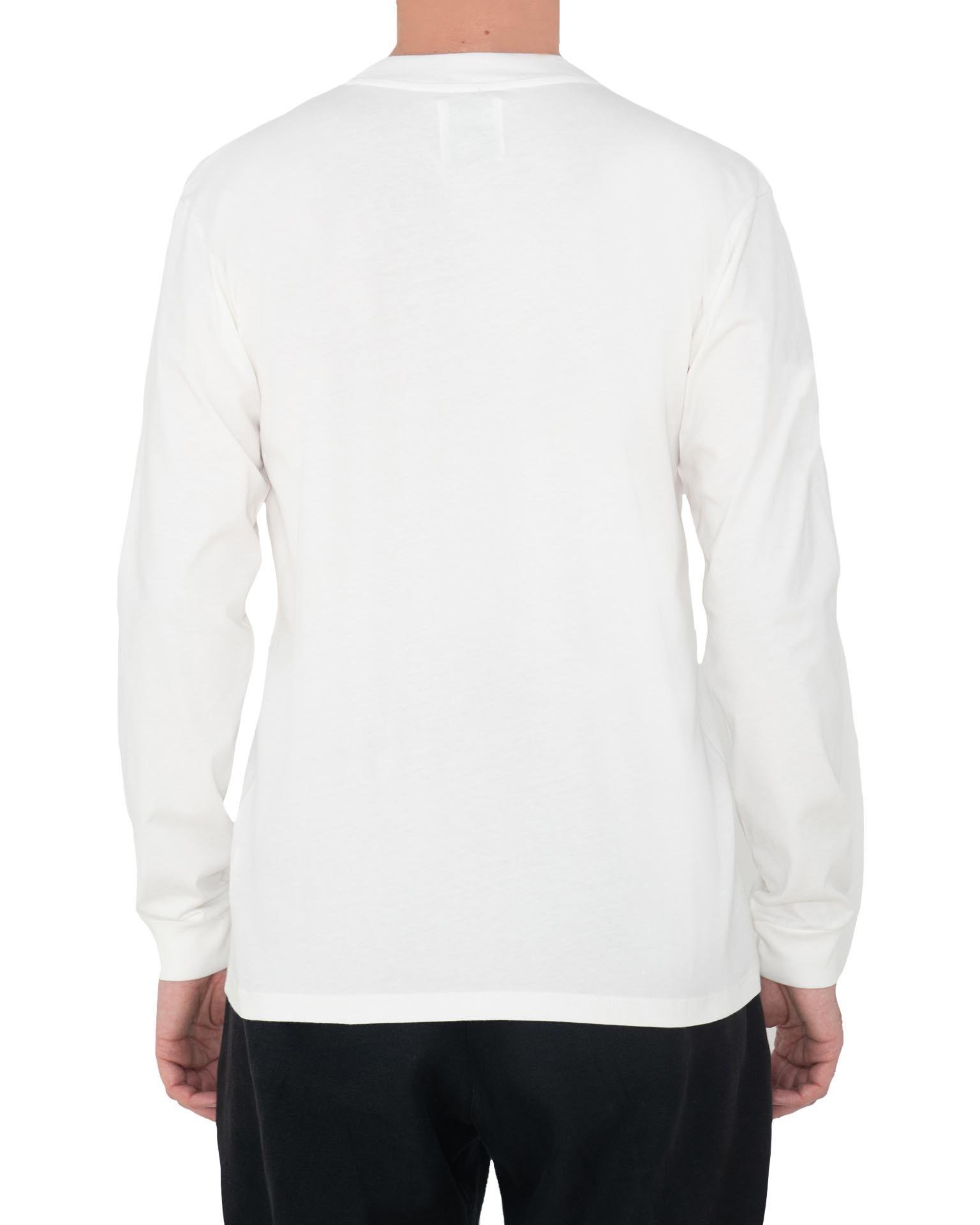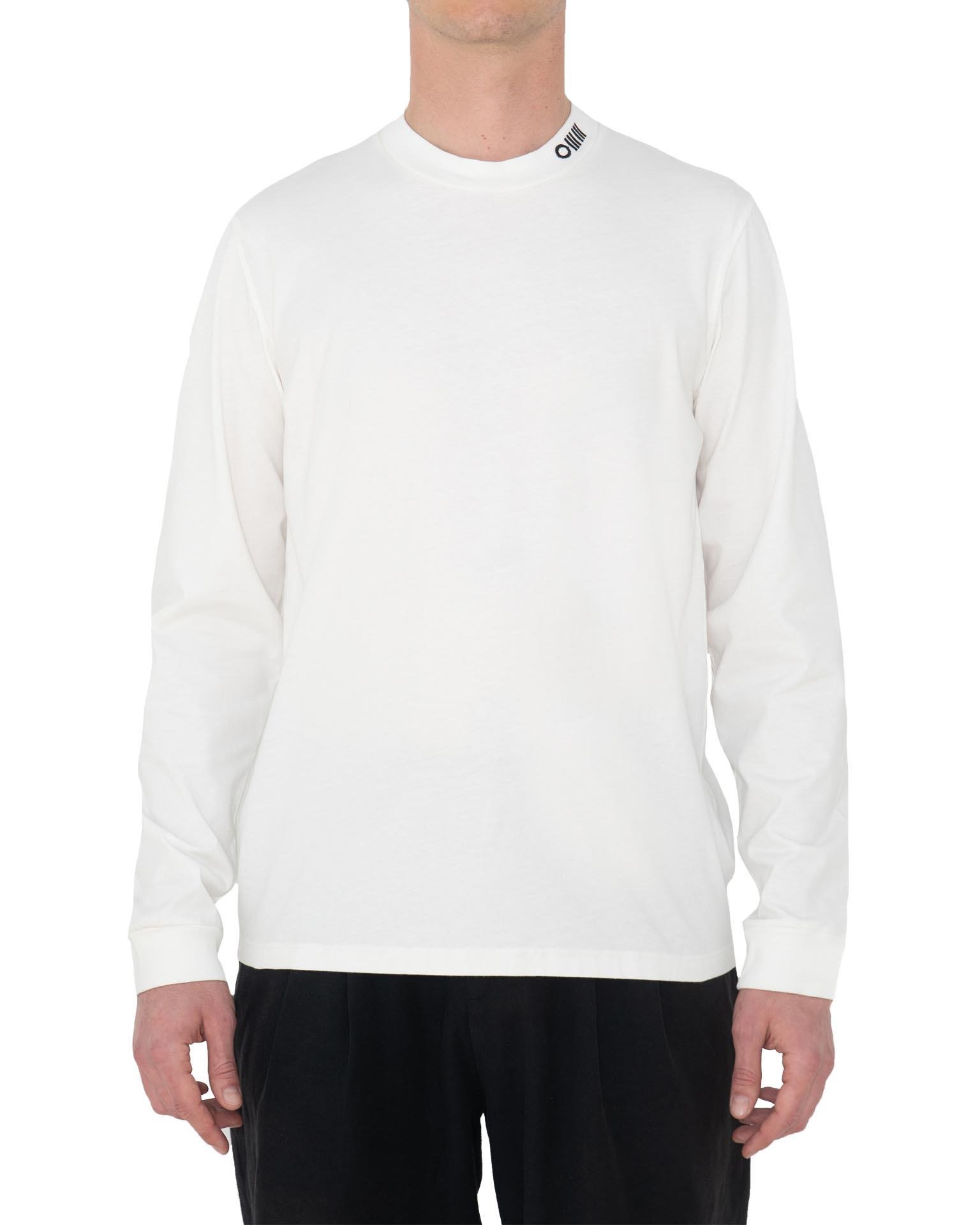 Long sleeve white men's t-shirt, 100% cotton, with black OMM logo embroidery on the collar.