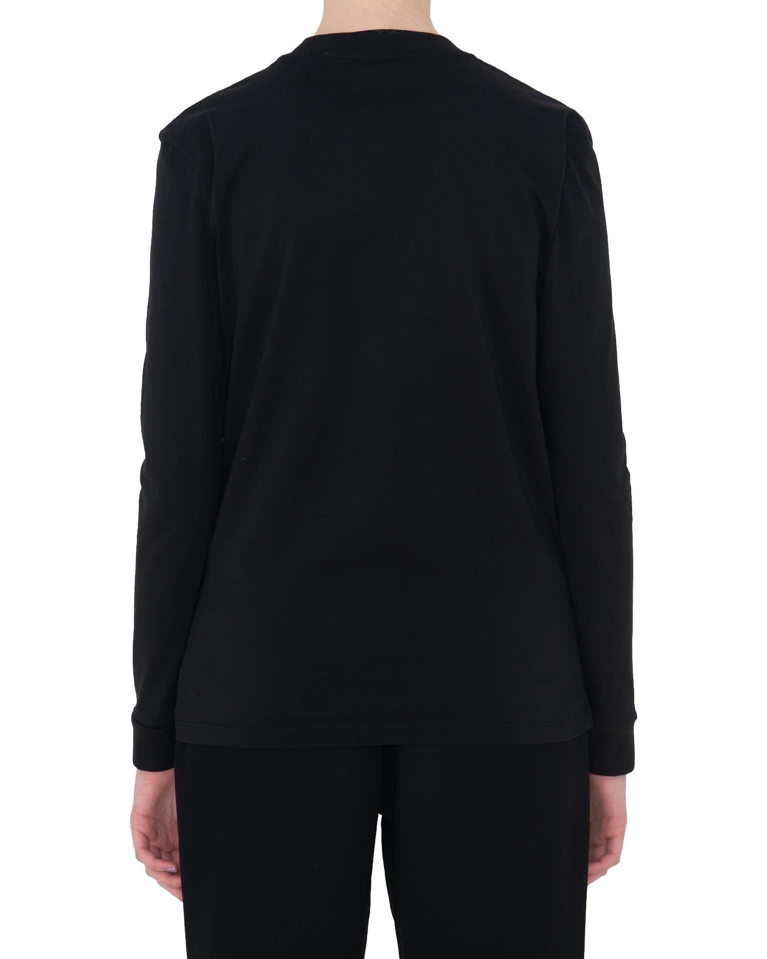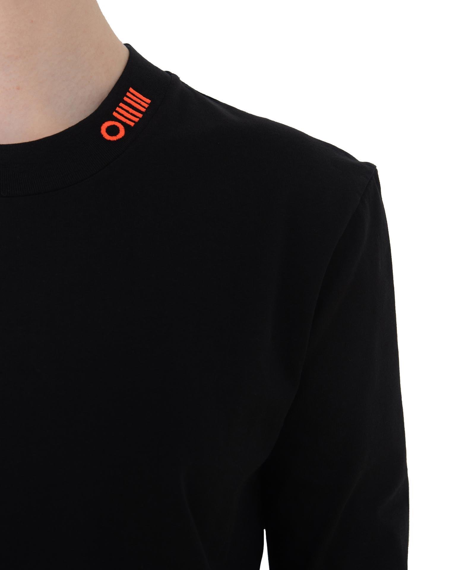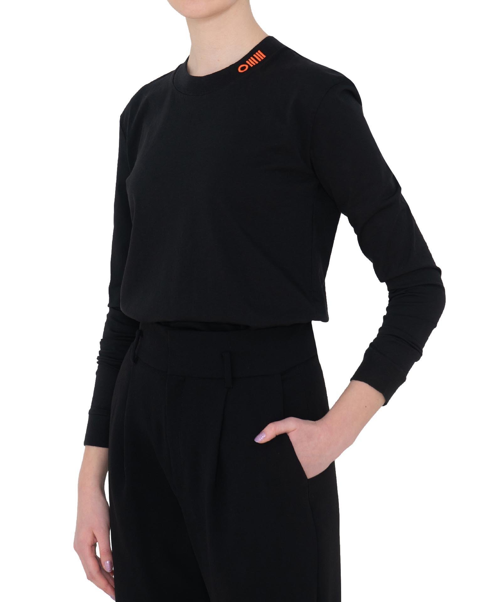 Long-sleeved black 100% cotton women's t-shirt with neon OMM logo embroidery on the collar.