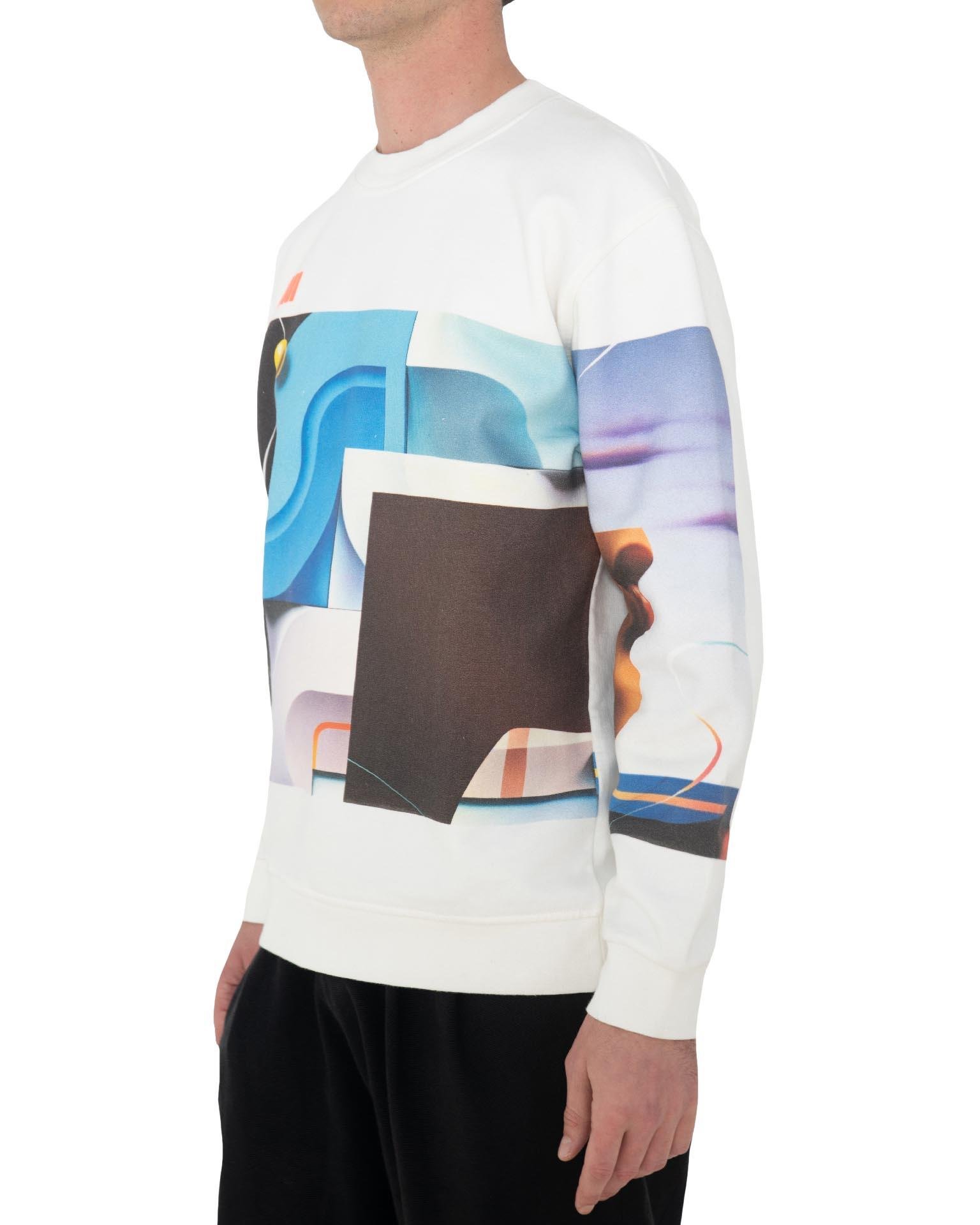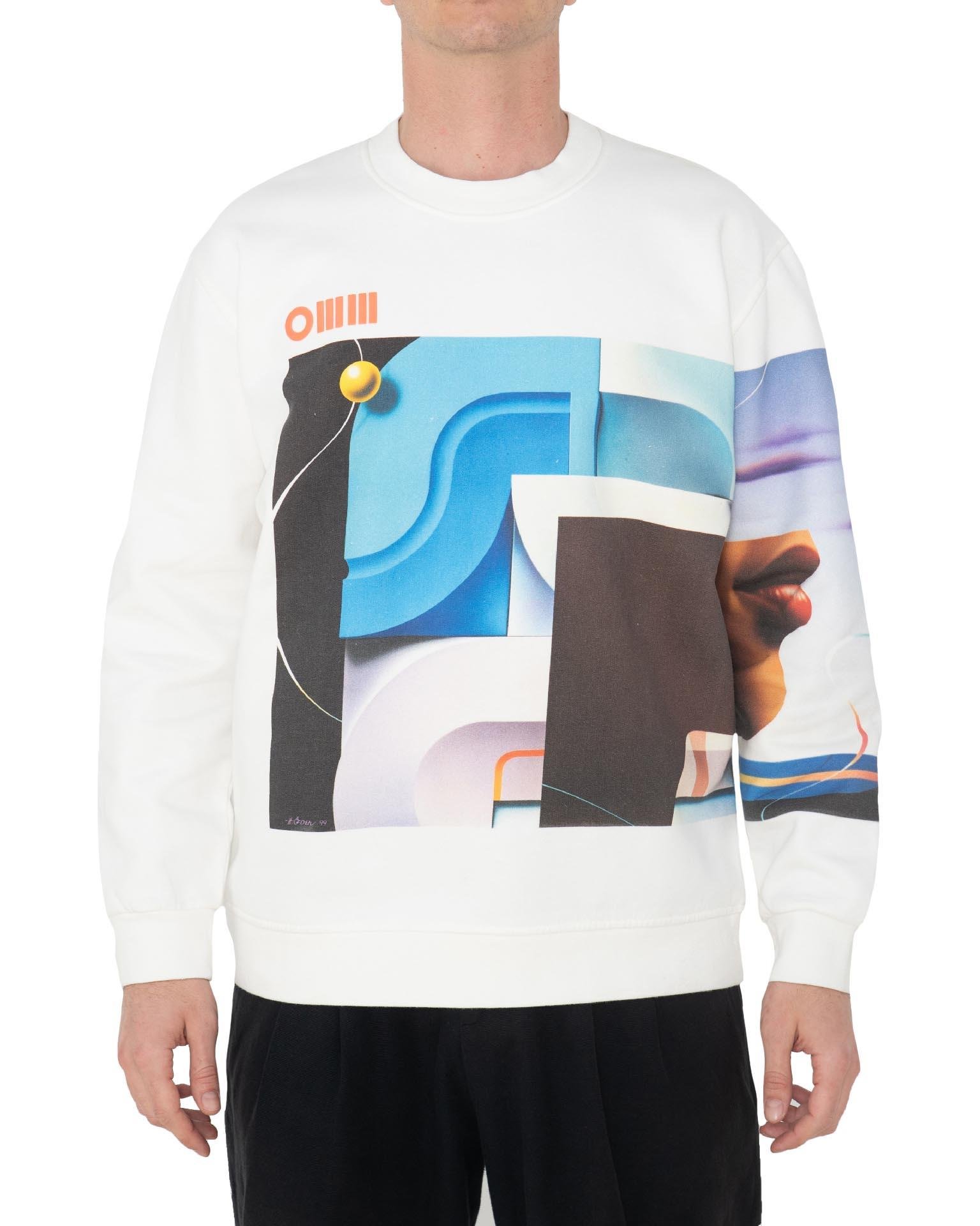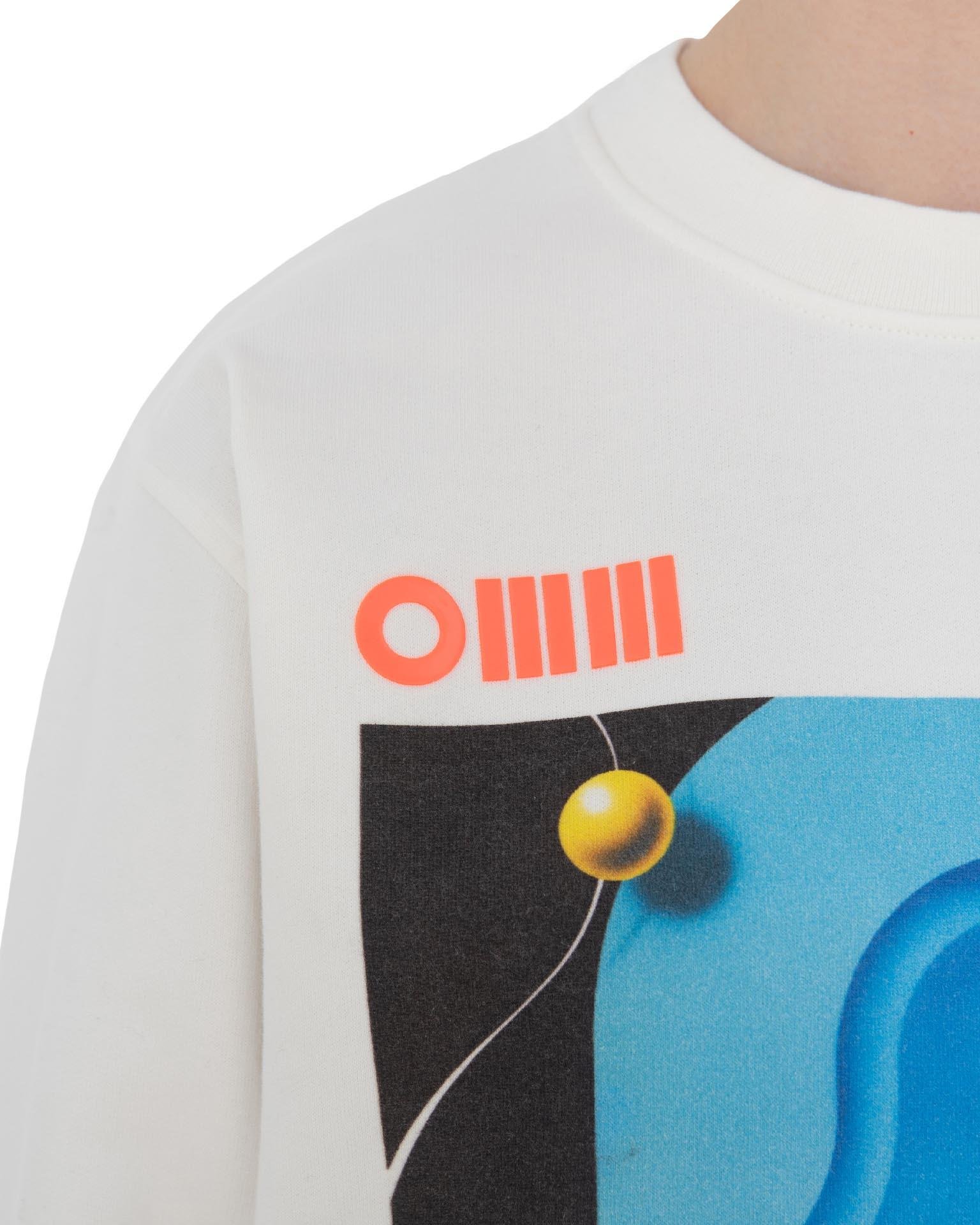 100% cotton, white unisex sweatshirt with raised fabric, featuring a print of artist Haluk Özden’s “Center of the Past and Future”. \n
