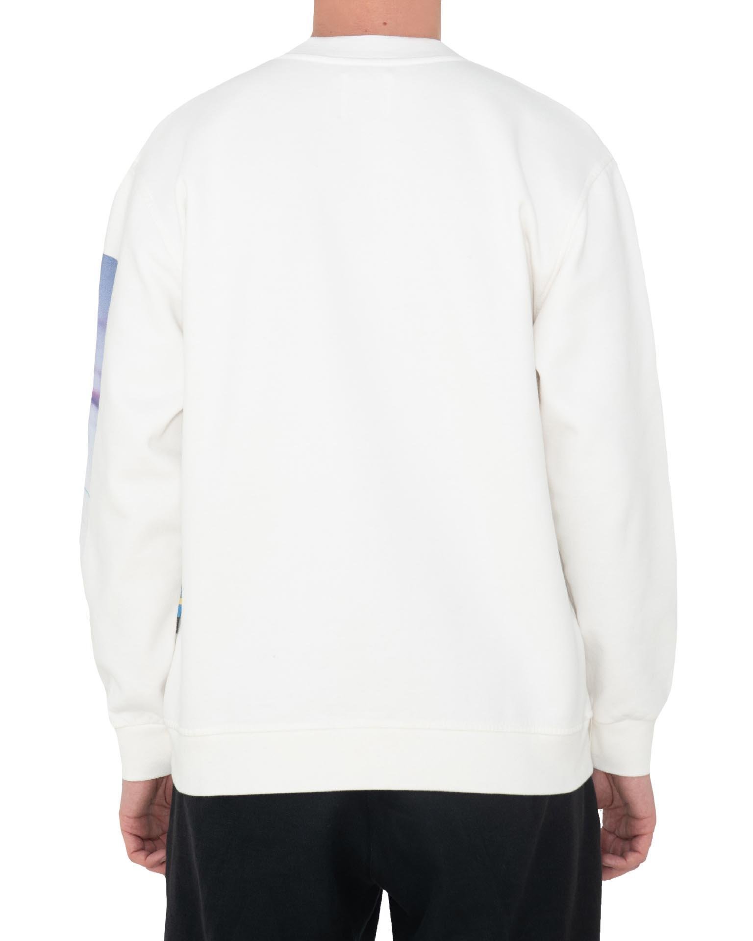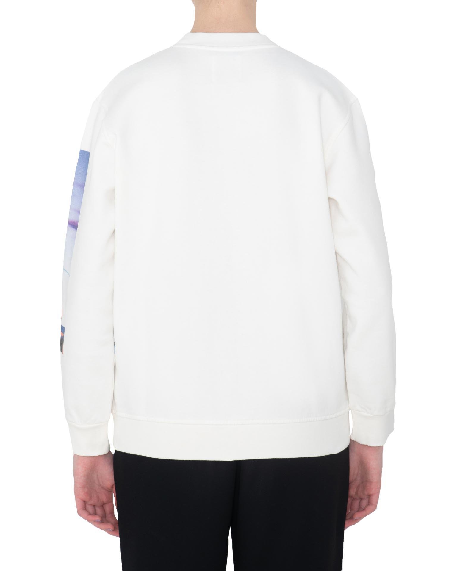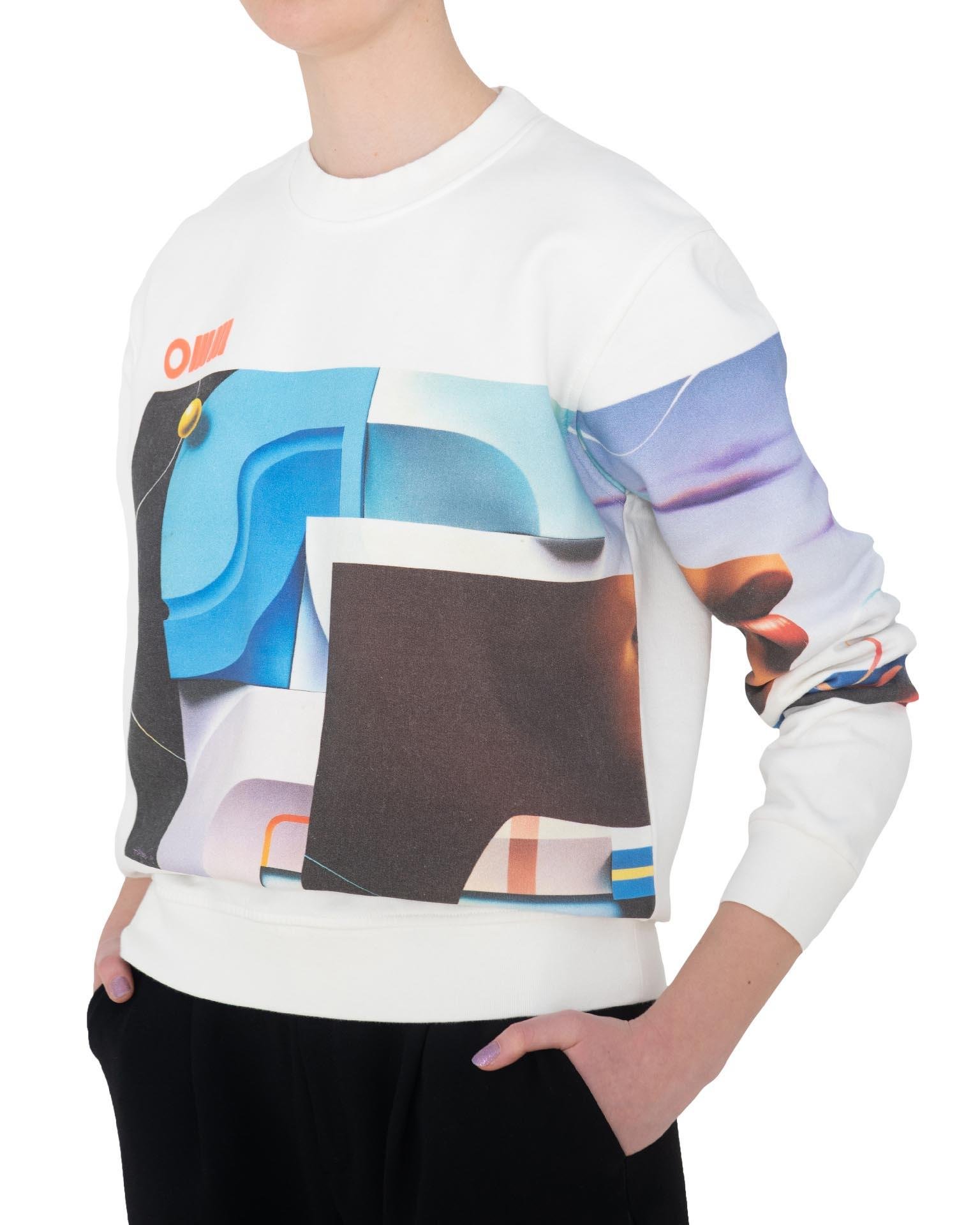 100% cotton, white unisex sweatshirt with raised fabric, featuring a print of artist Haluk Özden’s “Center of the Past and Future”. \n