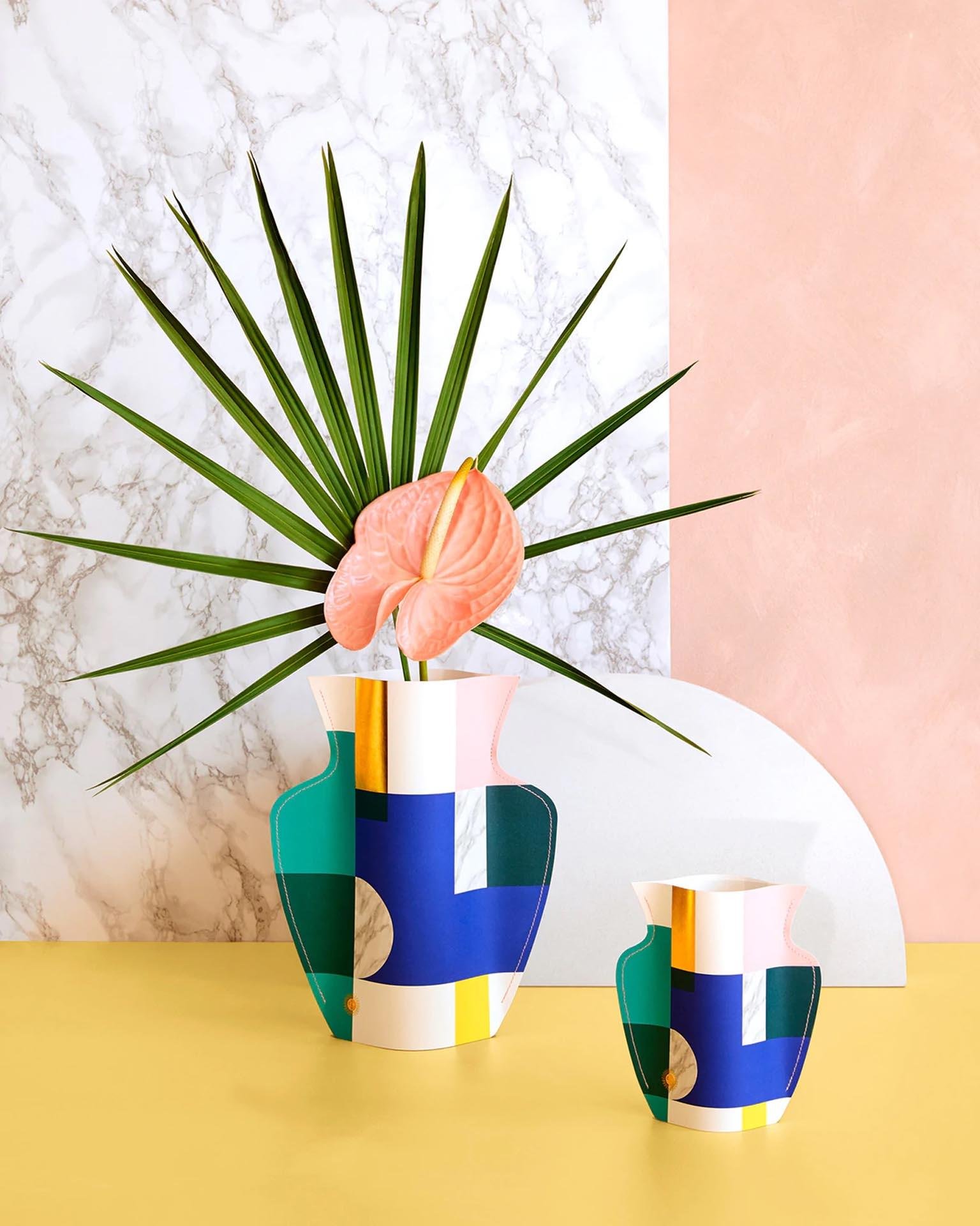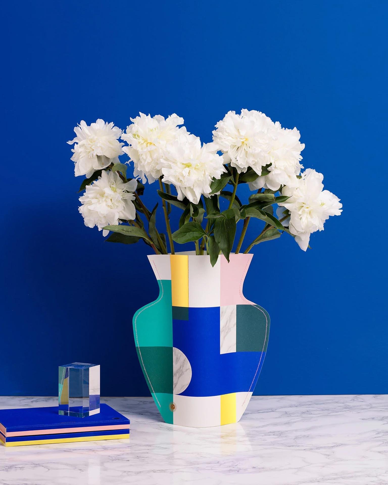 This 265 x 290 mm handcrafted flower vase is taking you on a voyage around the Mediterranean. Made of special 180 gr waterproof paper, it's a tribute to the ancient and sophisticated art of ceramics. The vase is sewn by hand and laminated with metallic foil stamping. Try this eye-catching vase to adorn your desk or dining table, or as a thoughtful and original gift. Let your imagination bloom.